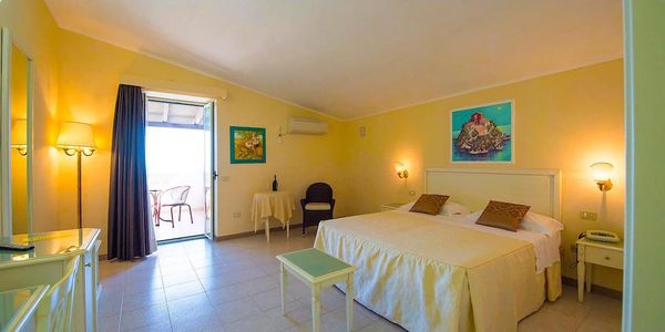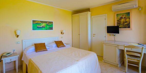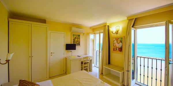 Svegiarsi in una camera rilassante, spaziosa, con vista mare, aria condizionata e colazione.